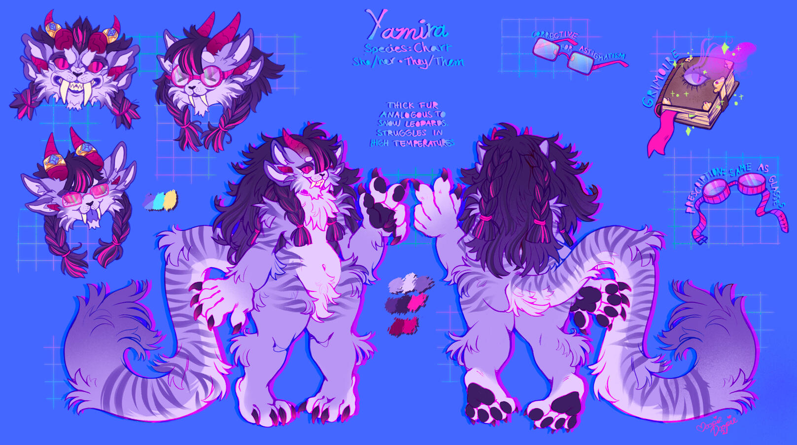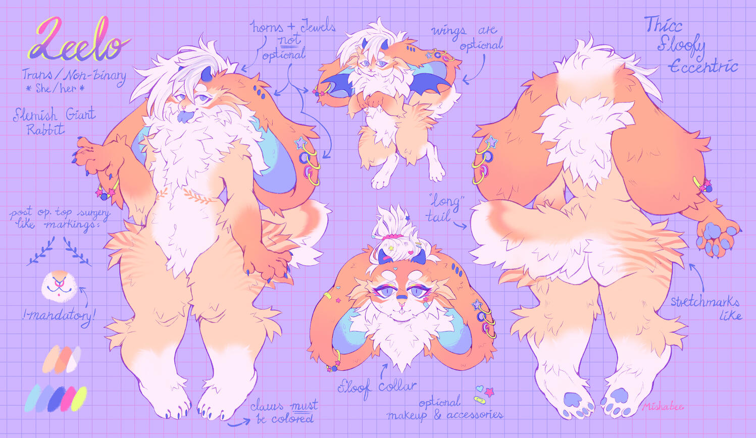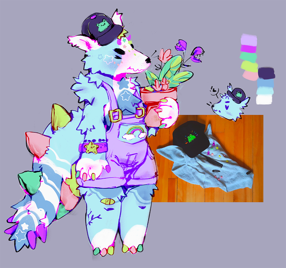 Includes a full body picture of the character (front/semi side view), the colors palette & name if there is